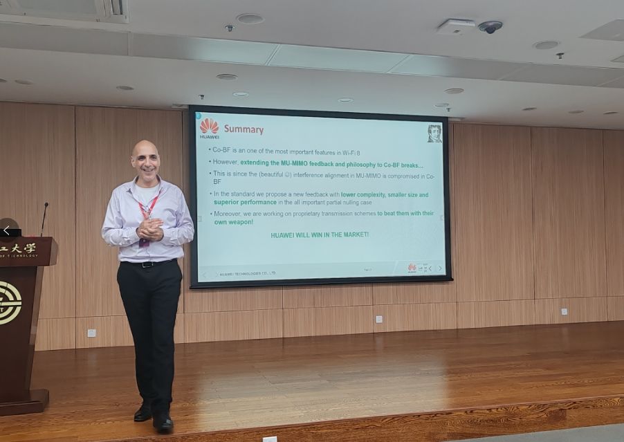 下午的专家报告环节,华为技术有限公司数据通信产品线Wi-Fi 产品CTO、傅里叶实验室主任Doron Ezri博士,围绕双Wi-Fi AP下行协同并发场景下的信道反馈与干扰对齐方案设计问题,介绍了华为公司提出的业界领先的基于联合 SVD 的协同波束成形(CoBF)机制。报告将信号处理、线性代数等基础理论与复杂工程实践紧密结合,既有严谨的数学理论推导,又展现卓越的工程思维,为与会者带来一场极具价值的学术盛宴。随后,“青年英才大工行”活动组织参会者走访校史馆及凌水湖,在实地参观中感受公司学术底蕴与科研实力。
