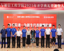 2025级研究生新生代表王梓沣登台发言,分享提前进组的科研经历与研究生规划,展现新时代青年积极进取的精神风貌,他号召全体员工携手奋斗,以青春之力传承信通人追求卓越的优良传统。随后,公司党委书记王瑜副教授、知行书院执行经理王波教授、副经理龚晓峰教授等老师为新生代表佩戴院徽。全体新生起立宣誓,誓言铿锵有力,彰显新一代信通人的使命担当。
