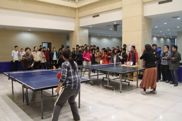 联谊球赛将师生混合分为A、B两队,正式比赛由队内选拔和团体比赛两个阶段组成。下午3点30分,比赛正式拉开帷幕。由郭成安、卢湖川两位领队老师分别带领其他几位老师、员工们进行队内选拔,以了解每位同学的特点和实力,为最终团体比赛热身。在队内选拔时,同学们既与老师切磋了球技,还在休息的间歇与老师们热情地聊天、积极地研究对阵策略,很快拉近了师生间的距离。