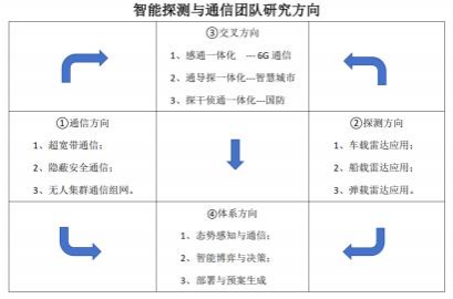 团队主要研究方向包括通信领域中的超宽带通信、隐蔽安全通信、无人集群通信组网等;探测领域中的车载雷达应用、船载雷达应用、弹载雷达应用;交叉方向的感通一体化、通导探一体化、探干侦通一体化等;以及体系方向的态势感知与通信、智能博弈与决策、部署与预案生成等。