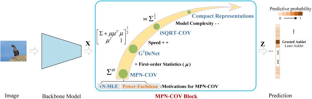 深度神经网络模型是计算机视觉和人工智能中最为核心的关键技术, 在图像和视频识别、场景理解、医疗诊断和 机器人感知等领域中起着基础性作用,是世界上各大科研机构和高科技公司的重点研发内容。然而已有的工作主 要集中在如何设计更宽或更深的神经网络架构, 却忽略了对高阶非线性的挖掘, 限制了模型性能的进一步提高。 对此, 课题组创新性地提出一种矩阵幂正规化高阶聚合深度卷积神经网络设计范式, 通过学习卷积特征二阶或更 高阶信息作为图像表征, 极大地增强了模型的非线性建模能力。在理论层面, 论文从概率和统计的角度证明了所 提出的模型能够在高维度和小样本条件下稳健地估计卷积特征的高阶统计量, 并进一步从信息几何的角度建立了 网络模型与黎曼测度之间的密切关联;在应用层面, 所提出的模型在通用物体识别/场景分类/细粒度分类/纹理 分类国际标准数据集上取得领先结果, 识别性能显著地优于已有模型。