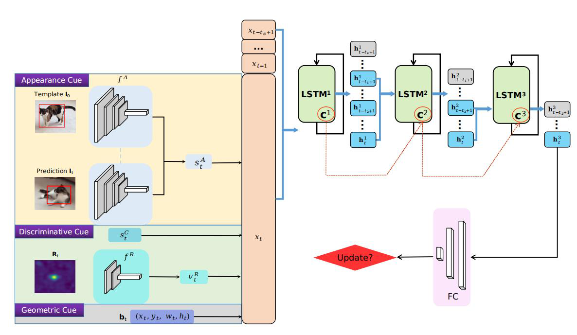 近年来,长时跟踪由于更贴近实际应用而逐渐引起关注。而在长时跟踪中,由于视频非常长,并且还有大量的消失出 境等挑战,使得在线更新充满了风险,这也导致很多在短时跟踪SOTA的算法在长时跟踪里表现不好。该论文提出了一 个长时更新控制器,将在线跟踪获取的几何信息、判别信息、外观信息进行时序封装,送入长短期记忆网络,之后做 一个二分类,来判断当前跟踪状态是否可以更新。